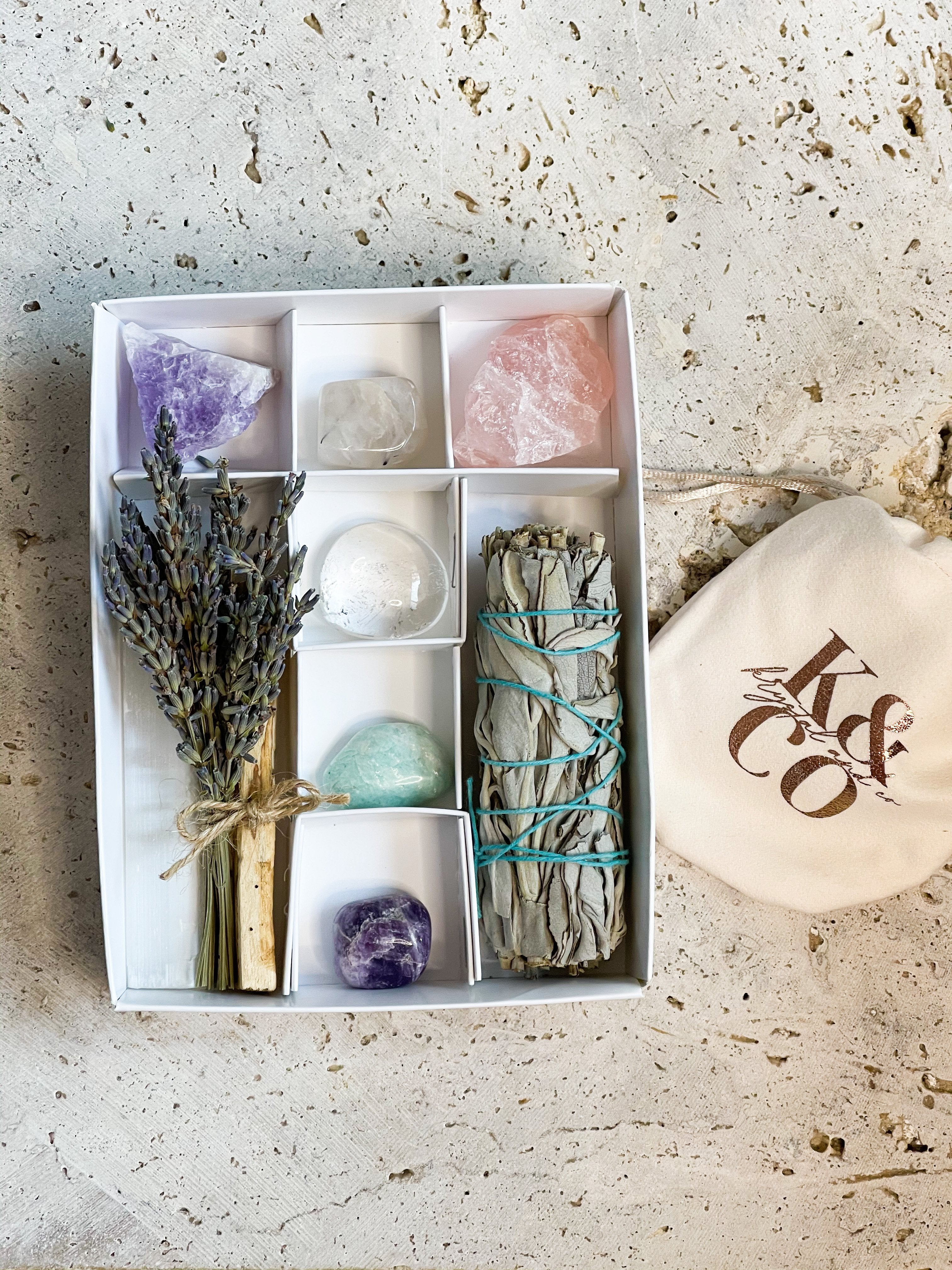 This set includes: a raw amethyst and rose quartz chunk, a palo santo or handmade incense, and lavender bundle, a selenite rod, and a black tourmaline in quartz raw or tumble, clear quartz, lepidolite and amazonite tumble and Krystal & co keepsake pouch.